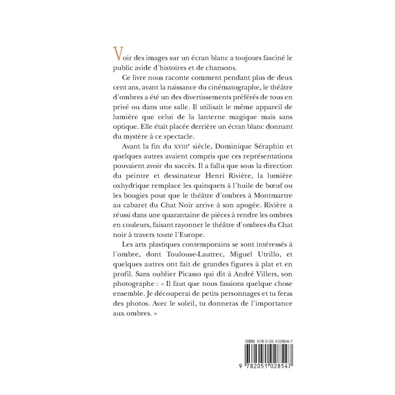 Ce livre nous raconte comment pendant plus de deux cent ans, avant la naissance du cinématographe, le théâtre d’ombres a été un des divertissements préférés de tous en privé ou dans une salle. Il utilisait le même appareil de lumière que celui de la lanterne magique mais sans optique. Elle était placée derrière un écran blanc donnant du mystère à ce spectacle.