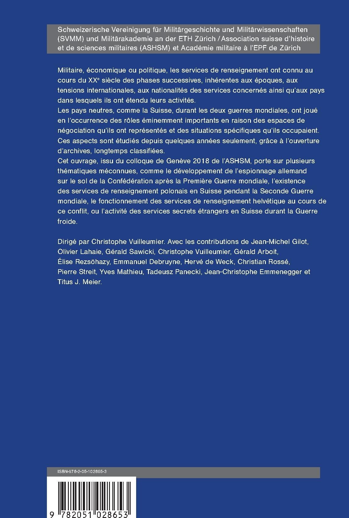 Cet ouvrage, issu du colloque de Genève 2018 de l’ASHSM, porte sur plusieurs thématiques méconnues, comme le développement de l’espionnage allemand sur le sol de la Confédération après la Première Guerre mondiale, l’existence des services de renseignement polonais en Suisse pendant la Seconde Guerre mondiale, le fonctionnement des services de renseignement helvétique au cours de ce conflit, ou l’activité des services secrets étrangers en Suisse durant la Guerre froide.