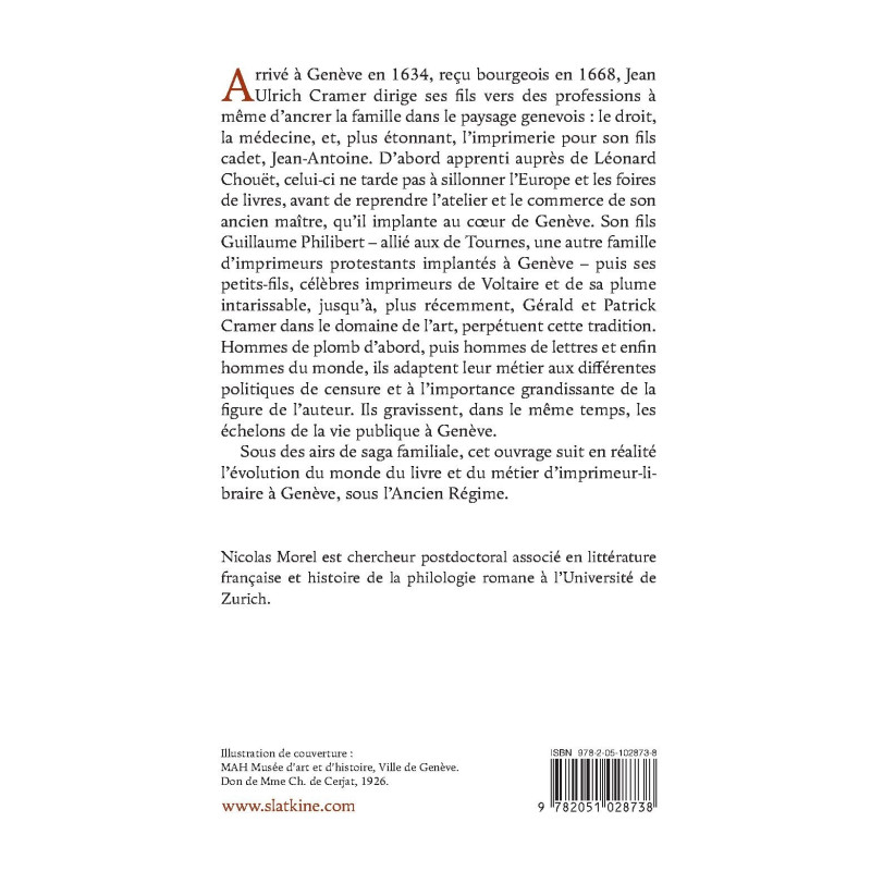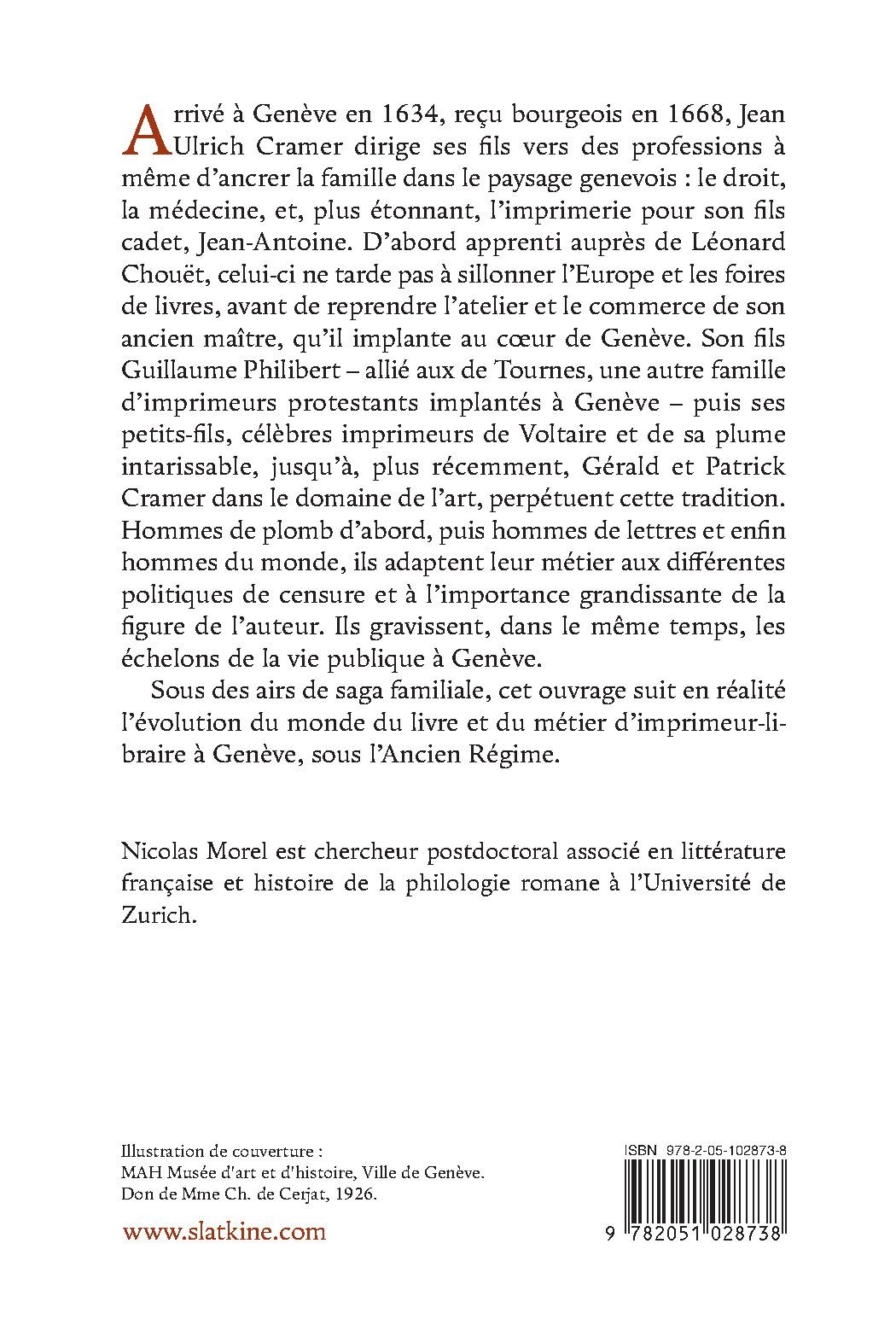 Arrivé à Genève en 1634, reçu bourgeois en 1668, Jean Ulrich Cramer dirige ses fils vers des professions à même d’ancrer la famille dans le paysage genevois : le droit, la médecine, et, plus étonnant, l’imprimerie pour son fils cadet, Jean-Antoine. D’abord apprenti auprès de Léonard Chouët, celui-ci ne tarde pas à sillonner l’Europe et les foires de livres, avant de reprendre l’atelier et le commerce de son ancien maître, qu’il implante au coeur de Genève. Son fils Guillaume Philibert – allié aux de Tournes, une autre famille d’imprimeurs protestants implantés à Genève – puis ses petits-fils, célèbres imprimeurs de Voltaire et de sa plume intarissable, jusqu’à, plus récemment, Gérald et Patrick Cramer dans le domaine de l’art, perpétuent cette tradition. Hommes de plomb d’abord, puis hommes de lettres et enfin hommes du monde, ils adaptent leur métier aux différentes politiques de censure et à l’importance grandissante de la figure de l’auteur. Ils gravissent, dans le même temps, les échelons de la vie publique à Genève.