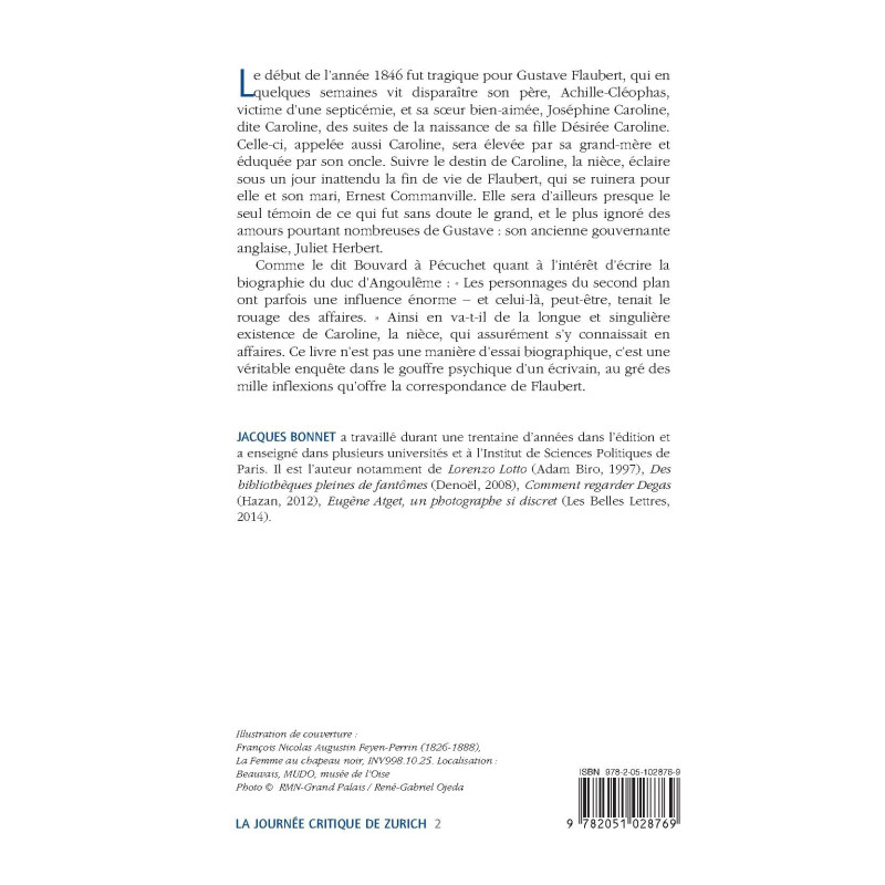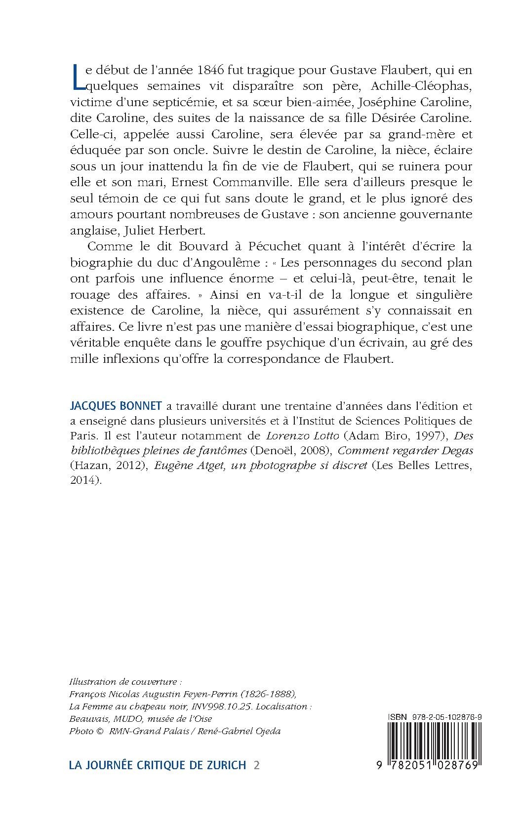 Le début de l’année 1846 fut tragique pour Gustave Flaubert, qui en quelques semaines vit disparaître son père, Achille-Cléophas, victime d’une septicémie, et sa sœur bien-aimée, Joséphine Caroline, dite Caroline, des suites de la naissance de sa fille Désirée Caroline. Celle-ci, appelée aussi Caroline, sera élevée par sa grand-mère et éduquée par son oncle. Suivre le destin de Caroline, la nièce, éclaire sous un jour inattendu la fin de vie de Flaubert, qui se ruinera pour elle et son mari, Ernest Commanville. Elle sera d’ailleurs presque le seul témoin de ce qui fut sans doute le grand, et le plus ignoré des amours pourtant nombreuses de Gustave : son ancienne gouvernante anglaise, Juliet Herbert.