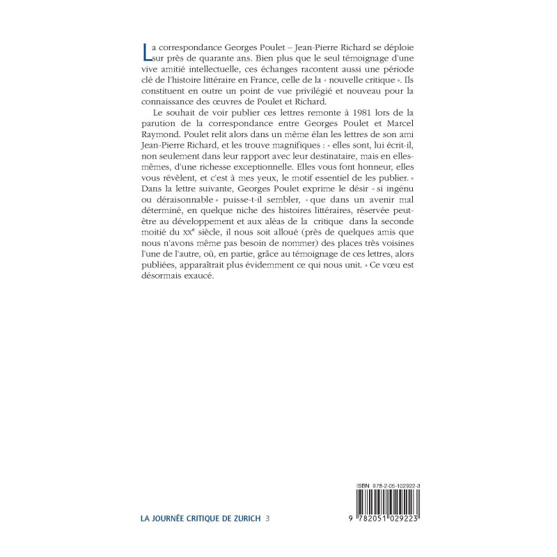 La correspondance Georges Poulet – Jean-Pierre Richard se déploie sur près de quarante ans. Bien plus que le seul témoignage d’une vive amitié intellectuelle, ces échanges racontent aussi une période clé de l’histoire littéraire en France, celle de la « nouvelle critique ». Ils constituent en outre un point de vue privilégié et nouveau pour la connaissance des œuvres de Poulet et Richard.