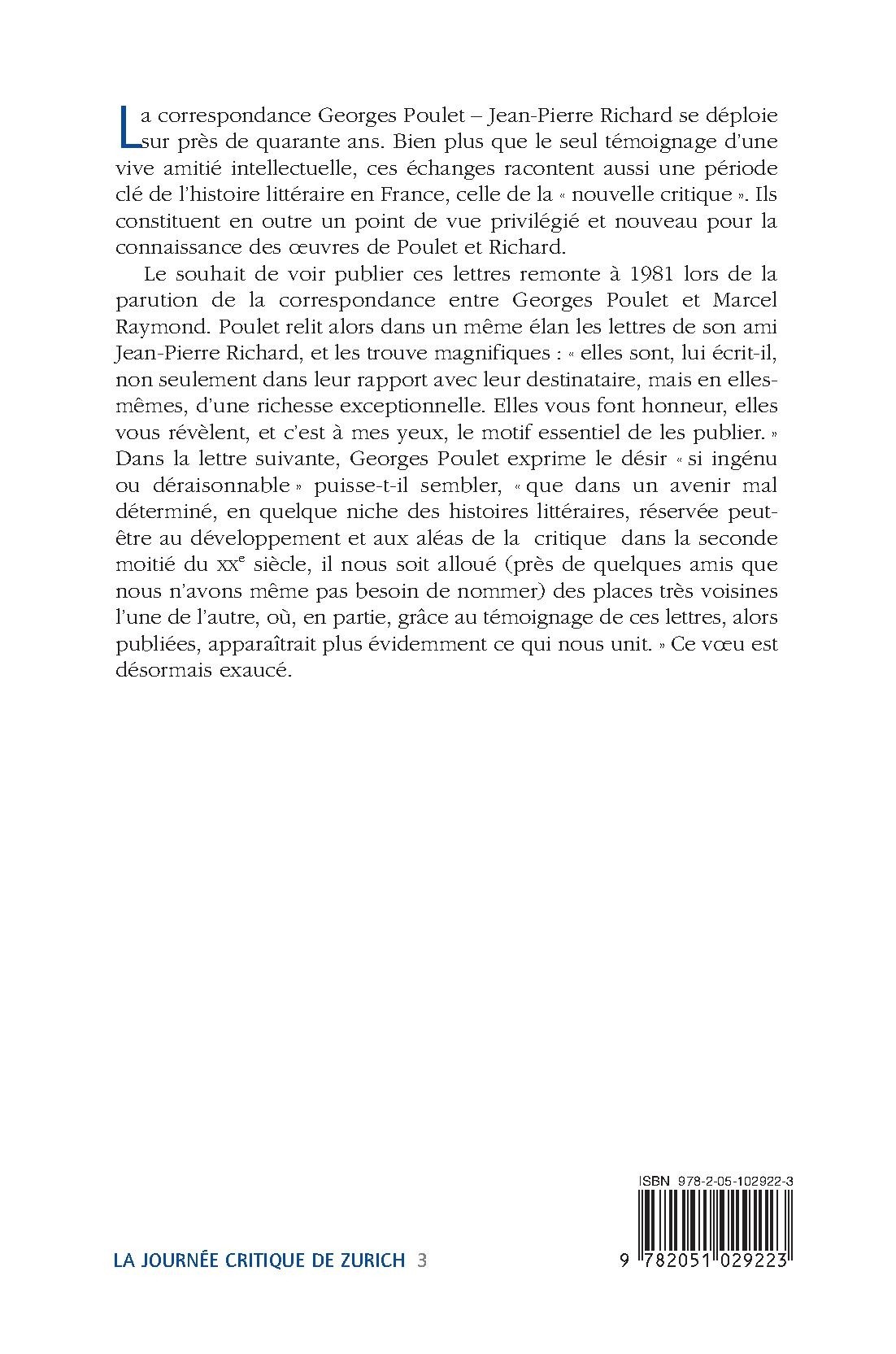 Le souhait de voir publier ces lettres remonte à 1981 lors de la parution de la correspondance entre Georges Poulet et Marcel Raymond. Poulet relit alors dans un même élan les lettres de son ami Jean-Pierre Richard, et les trouve magnifiques : « elles sont, lui écrit-il, non seulement dans leur rapport avec leur destinataire, mais en ellesmêmes, d’une richesse exceptionnelle. Elles vous font honneur, elles vous révèlent, et c’est à mes yeux, le motif essentiel de les publier. » Dans la lettre suivante, Georges Poulet exprime le désir « si ingénu ou déraisonnable » puisse-t-il sembler, « que dans un avenir mal déterminé, en quelque niche des histoires littéraires, réservée peutêtre au développement et aux aléas de la ''critique'' dans la seconde moitié du XXe siècle, il nous soit alloué (près de quelques amis que nous n’avons même pas besoin de nommer) des places très voisines l’une de l’autre, où, en partie, grâce au témoignage de ces lettres, alors publiées, apparaîtrait plus évidemment ce qui nous unit. » Ce vœu est désormais exaucé.