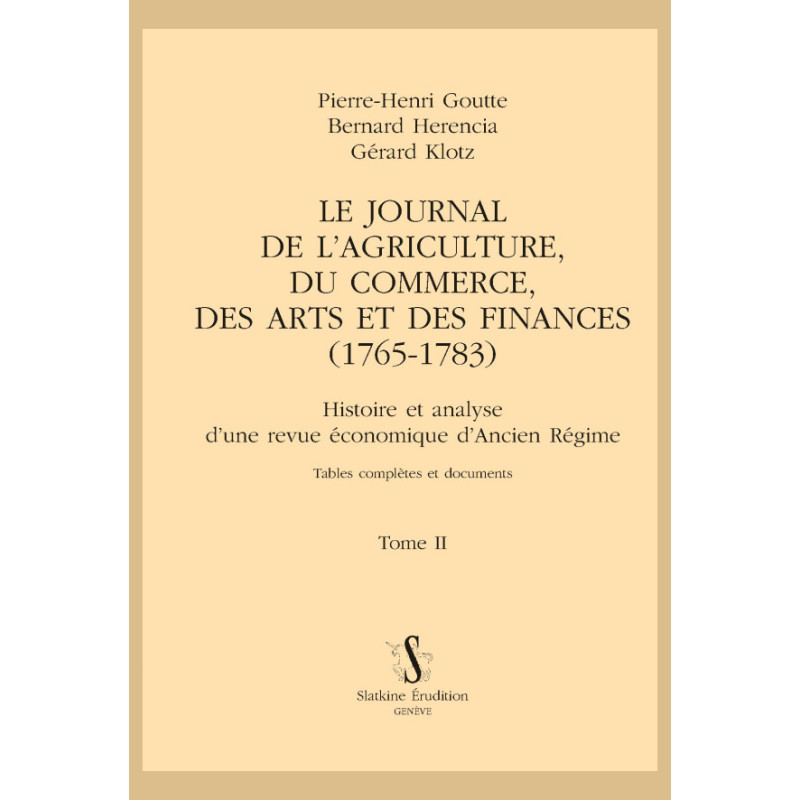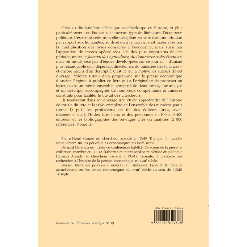 C’est au dix-huitième siècle que se développe en Europe, et plus particulièrement en France, un nouveau type de littérature, l’économie politique. L’essor de cette nouvelle discipline en voie d’autonomisation par rapport aux humanités, au droit ou à la morale, s’est matérialisé par la multiplication des livres consacrés à l’économie, mais aussi par l’apparition de revues spécialisées. Un des plus importants de ces périodiques est le Journal de l’Agriculture, du Commerce et des Finances, mais on ne dispose pas d’études développées sur ce journal – d’autant plus remarquable qu’il dépendait directement du ministère des Finances – et encore moins d’un descriptif. C’est ce qui a motivé les auteurs de cet ouvrage, fédérés autour d’un programme sur la presse économique d’Ancien Régime, à publier ce livre qui a l’originalité de proposer au lecteur dans un même ensemble, composé de deux tomes, une analyse et un descriptif accompagnés de nombreux compléments et annexes construits pour faciliter le travail des chercheurs.