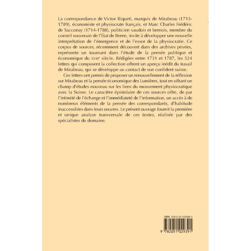 Ces lettres ont permis de proposer un renouvellement de la réflexion sur Mirabeau et la pensée économique des Lumières, tout en offrant un champ d’études nouveau sur les liens du mouvement physiocratique avec la Suisse. Le caractère épistolaire de ces sources offre, de par l’intimité de l’échange et l’immédiateté de l’information, un accès à de nombreux éléments de la pensée des correspondants, d’habitude inaccessibles dans leurs œuvres. Le présent ouvrage fournit la première et unique analyse transversale de ces textes, réalisée par des spécialistes du domaine.