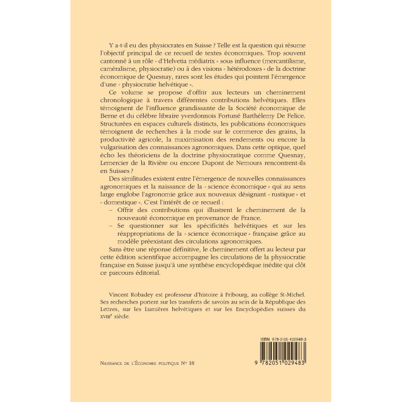 Y a-t-il eu des physiocrates en Suisse ? Telle est la question qui résume l’objectif principal de ce recueil de textes économiques. Trop souvent cantonné à un rôle « d’Helvetia médiatrix » sous influence (mercantilisme, caméralisme, physiocratie) ou à des visions « hétérodoxes » de la doctrine économique de Quesnay, rares sont les études qui pointent l’émergence d’une « physiocratie helvétique ».