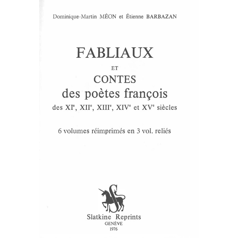 publiés par Barbazan. Nvelle édition augmentée et revue sur les manuscrits de la biblioth. impériale par Méon.(1808-1823). 6 vols. réimprimés en 3 vol