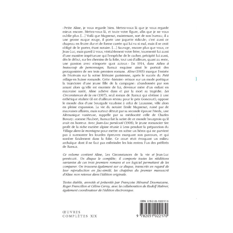 Aline (1905) marque l`entrée de l`écrivain sur la scène littéraire parisienne, après le succès du Petit village en Suisse romande. Cette " histoire " retrace sur un mode poétique la trajectoire d`une jeune fille de la campagne : abandonnée par son amant alors qu`elle est enceinte de lui, devenue mère d`un enfant en mauvaise santé, Aline achève dans et par la mort sa tragédie. Les Circonstances de la vie (1907), seul roman de Ramuz qui obéisse à une esthétique réaliste (il est d`ailleurs retenu pour le prix Goncourt), oppose le monde clos d`une bourgade vaudoise à celui de Lausanne, ville alors en pleine expansion. La vie du notaire Emile Magnenat, ruiné par de mauvaises affaires, mais surtout détruit par sa seconde épouse Frieda, une Alémanique vaniteuse, rappelle par sa médiocrité celle de Charles Bovary: comme Flaubert, Ramuz fait la satire de ce monde bourgeois qu`il avait en horreur. Avec Jean-Luc persécuté (1908), le jeune romancier tire profit de la riche matière alpine réunie à Lens pendant la préparation du Village dans la montagne pour mettre en scène un héros qui ne parvient pas à surmonter les lourdes épreuves marquant son parcours, et qui sombre fatalement dans la folie. Ce court récit évoquant un milieu archaïque dont il ne faut pas enfreindre les lois restera l`un des préférés de Ramuz. Ce volume contient Aline, Les Circonstances de la vie et Jean-Luc persécuté. Un disque le complète; il comporte toutes les rééditions variantes de ces trois premiers romans et un logiciel permettant de les comparer. On trouvera également sur ce disque, transcrits en regard de leur reproduction en fac-similé, les chapitres du premier manuscrit d`Aline non retenus dans l`édition originale.