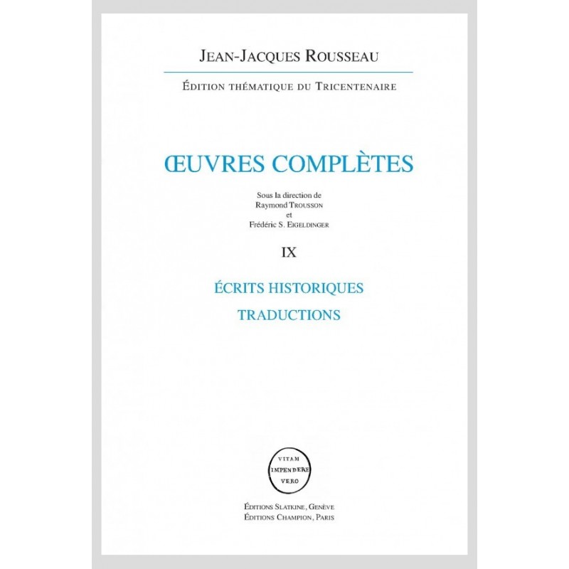Chronologie universelle; Textes autour de l`Ouvrage sur les femmes de mme Dupin; Fragments politiques sur Sparte; fragments d`une histoire du Valais; Lettres sur la Suisse; Histoire du gouvernement de Genève; Lettre de Corchut à l`empereur Sélim; traduction de l`Ode de jean Puthod; Un exytrait du onzième livre de la "Géographie" de Strabon; Essai de traduction d`un épître d`Horace; Traduction du premier livre de l`"Histoire" de Tacite; Traduction de l`"Apolocyntosis" de Sénèque; Traduction du "DE brevitate vitoe" de Sénèque; Olinde et Sophronie tiré du Tasse; Essai de traduction du chant I de la "Jérusalem délivrée" du Tasse; Traduction de fragments de Platon; Notes tirées des "Oeuvres morales" de Plutarque; Citations extraites de Muralt, avec des notes de Rousseau; "Disjecta membra"