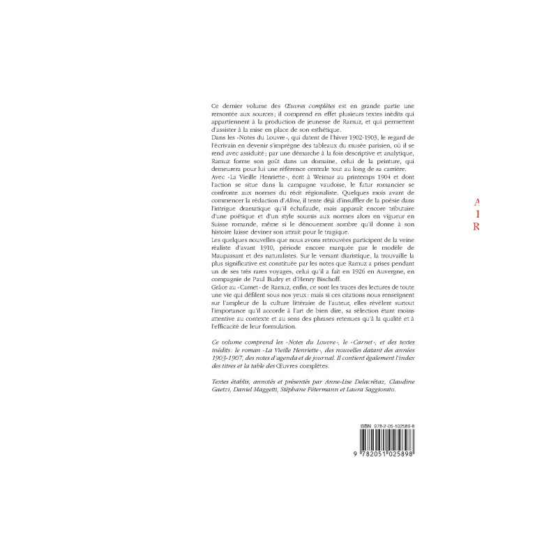 Ce dernier volume des « Œuvres complètes » est en grande partie une remontée aux sources ; il comprend en effet plusieurs textes inédits qui appartiennent à la production de jeunesse de Ramuz, et qui permettent d’assister à la mise en place de son esthétique. Dans les « Notes du Louvre », qui datent de l’hiver 1902-1903, le regard de l’écrivain en devenir s’imprègne des tableaux du musée parisien, où il se rend avec assiduité ; par une démarche à la fois descriptive et analytique, Ramuz forme son goût dans un domaine, celui de la peinture, qui demeurera pour lui une référence centrale tout au long de sa carrière. Avec « La Vieille Henriette », écrit à Weimar au printemps 1904 et dont l’action se situe dans la campagne vaudoise, le futur romancier se confronte aux normes du récit régionaliste. Quelques mois avant de commencer la rédaction d’Aline, il tente déjà d’insuffler de la poésie dans l’intrigue dramatique qu’il échafaude, mais apparaît encore tributaire d’une poétique et d’un style soumis aux normes alors en vigueur en Suisse romande, même si le dénouement sombre qu’il donne à son histoire laisse deviner son attrait pour le tragique. Les quelques nouvelles que nous avons retrouvées participent de la veine réaliste d’avant 1910, période encore marquée par le modèle de Maupassant et des naturalistes. Grâce au « Carnet » de Ramuz, enfin, ce sont les traces des lectures de toute une vie qui défilent sous nos yeux : mais si ces citations nous renseignent sur l’ampleur de la culture littéraire de l’auteur, elles révèlent surtout l’importance qu’il accorde à l’art de bien dire, sa sélection étant moins attentive au contexte et au sens des phrases retenues qu’à la qualité et à l’efficacité de leur formulation. Ce volume contient également l’index des titres et la table des « Œuvres complètes ».