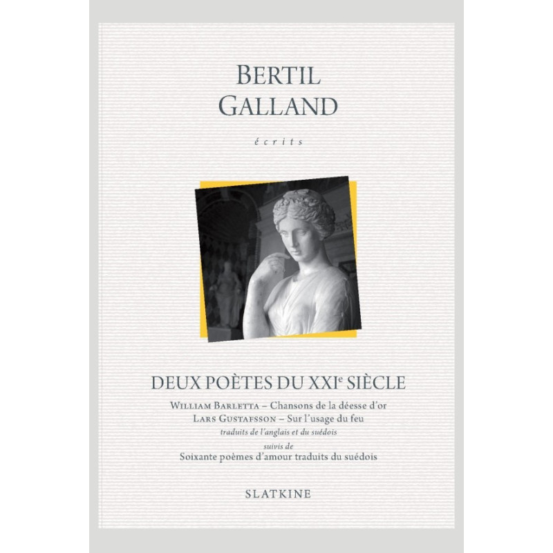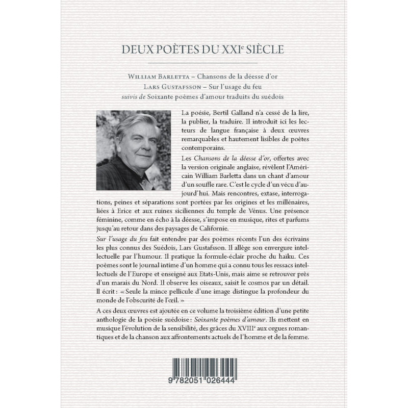 French readers are here introduced to two remarkable works of contemporary poetry: William Barletta’s Chansons de la déesse d’or (presented both in French and in the original English) and Lars Gustafsson’s Sur l’usage du feu (translated from the Swedish), along with a short anthology of Swedish poetry.